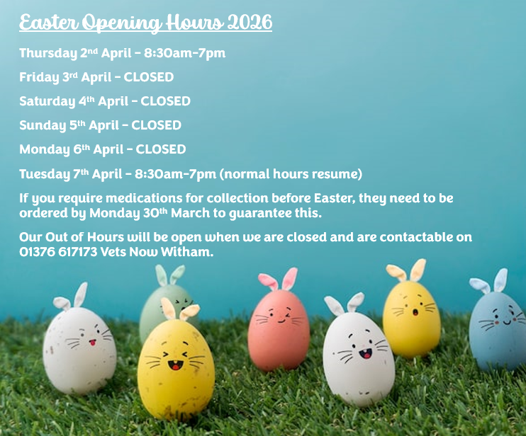 Our out of hours service is provided by Vets Now Witham and they cover us from 7pm until 8:30am. Their contact number is 01376 617173.